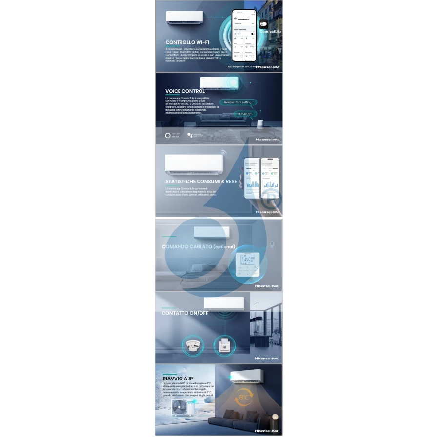 - Los aires acondicionados Hisense se pueden gestionar cómodamente dentro y fuera de casa con un dispositivo móvil y una conexión Wi-Fi. ConnectLife es la aplicación fácil de usar con una interfaz intuitiva que te permite controlar el aire acondicionado estés donde estés. La aplicación está disponible para iOS y Android.