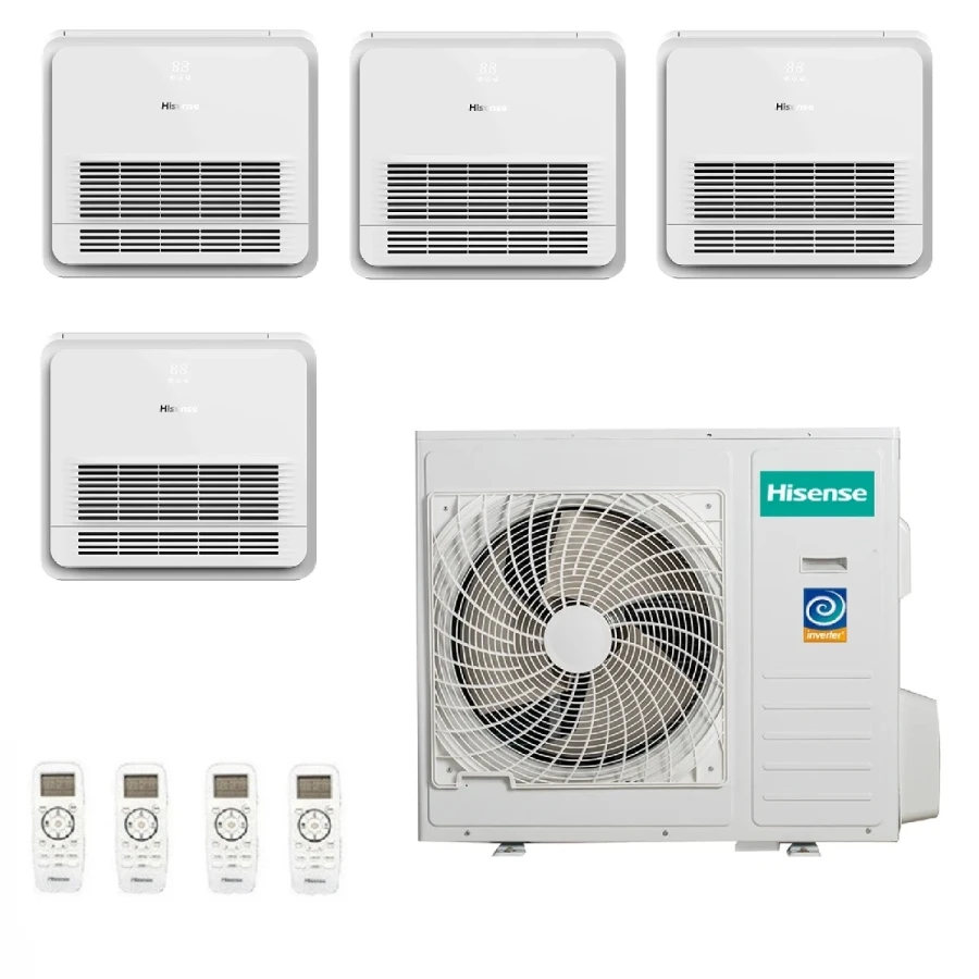 Climatizador Hisense Cuatro Split Serie Console WiFi Opcional 9000+9000+9000+9000 Btu Consola de calefacción compacta con bomba de calor de alta eficiencia y bajo consumo energético, deshumidificador, mando a distancia por infrarrojos incluido.