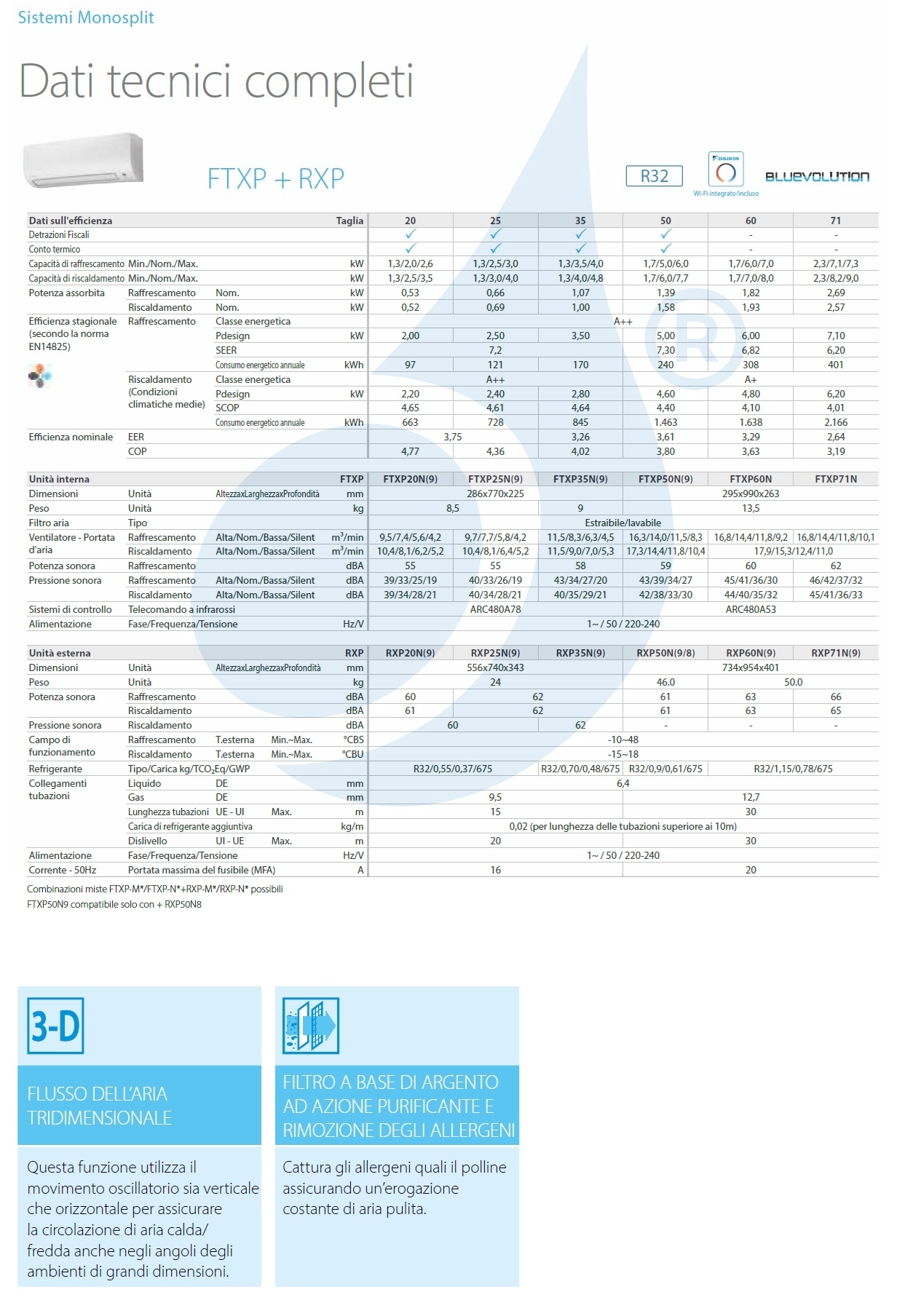 Climatizador Daikin Mono Split serie Comfora FTXP WiFi Opcional 21000 Btu calefacción con bomba de calor con baja absorción de corriente en clase energética alta Función deshumidificadora, purificación del aire con eliminación de virus y bacterias.