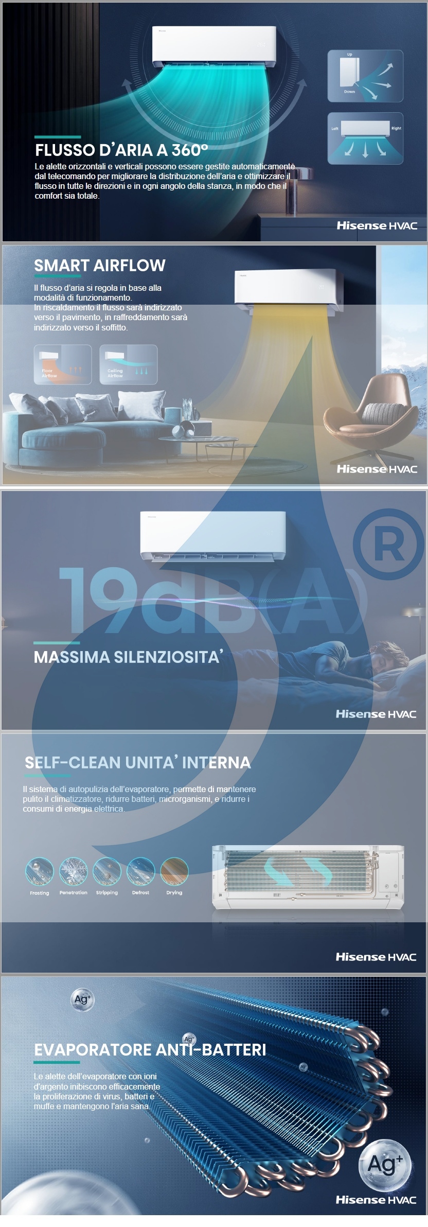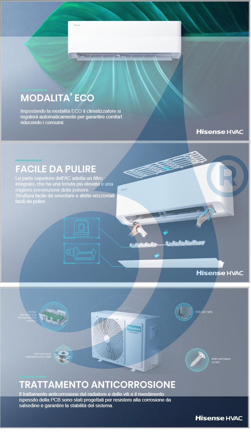 - La tecnología de limpieza patentada de Hisense garantiza el máximo rendimiento de la unidad interna y externa. El proceso de autolimpieza mediante congelación, descongelación y secado a altas temperaturas elimina el polvo, bacterias de las unidades de manera fácil y efectiva para mantener el aire acondicionado limpio y seguro. La función de autolimpieza se activa mediante el control remoto y está disponible en todas las unidades interiores montadas en la pared y en las unidades exteriores de división única.