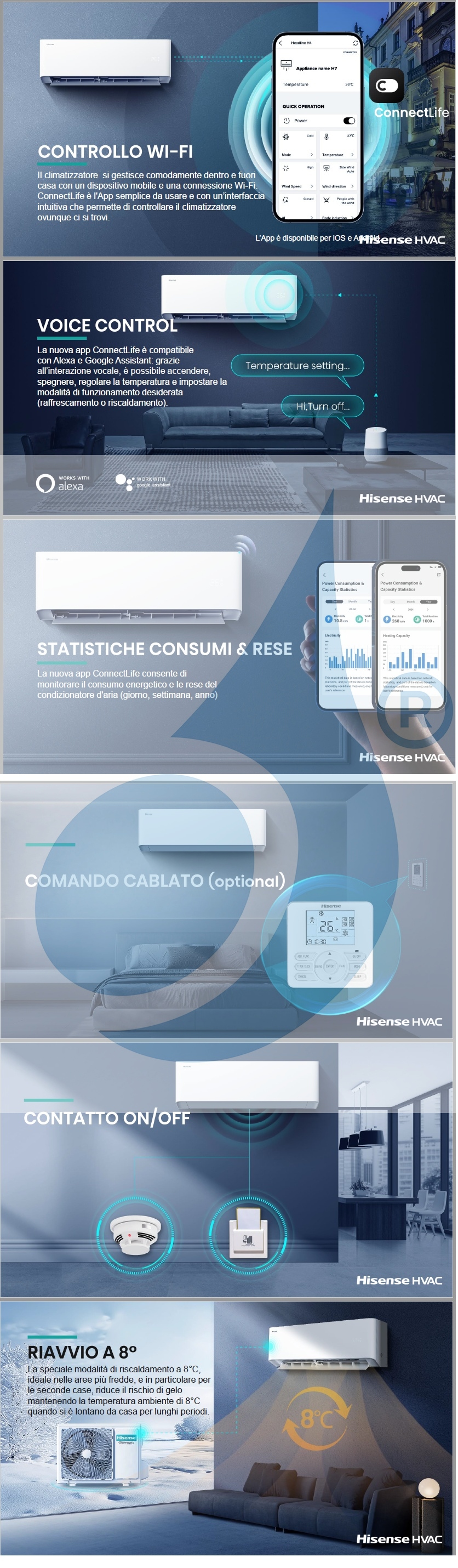 - Los aires acondicionados Hisense se pueden gestionar cómodamente dentro y fuera de casa con un dispositivo móvil y una conexión Wi-Fi. ConnectLife es la aplicación fácil de usar con una interfaz intuitiva que te permite controlar el aire acondicionado estés donde estés. La aplicación está disponible para iOS y Android.