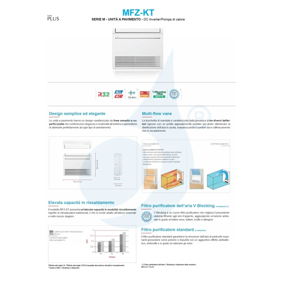 El modelo MFZ-KT tiene una alta capacidad en modo calefacción en comparación con los aires acondicionados tradicionales, lo que lo hace adecuado para uso en invierno y entretiempo.La salida de aire se caracteriza por la presencia de tres deflectores diferentes, cada uno con un perfil específicamente diseñado para optimizar la distribución del aire saliente, maximizando el confort tanto en refrigeración como en calefacción.